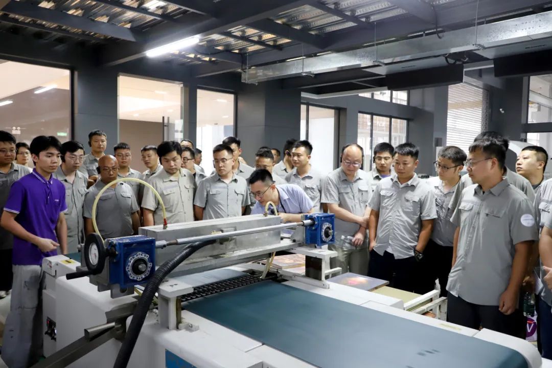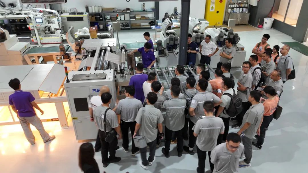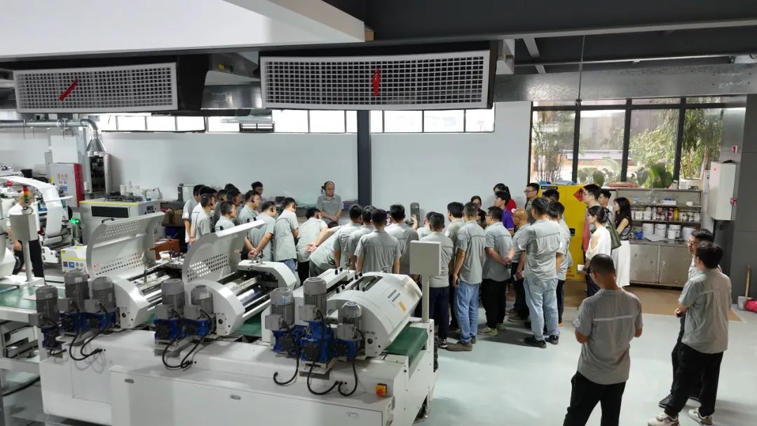 考察團分成兩組深入生產一線,開啟深度參觀。在專業引導員的引領下,從機加車間到裝配1車間,再裝配3車間內,先后參觀了輥涂、淋涂、噴漆、平貼、平壓等各個產線設備。這些先進的設備和智能化的生產流程,讓工程師們對表面涂飾工藝有了更直觀的認識,也感受到了普瑞特在智能制造領域的強大實力。
